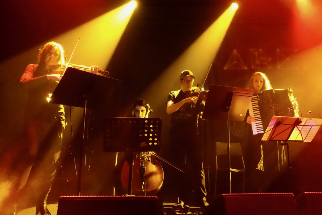 Dieses durchaus auch im Privaten metallisch unterwanderte Kammerensemble trägt nicht nur das Grundgerüst der klassischen Stücke dieses Abends, wobei es sich immer wieder von der Band unter die Arme greifen lässt, es interpretiert auch Teile der ALKALOID-Songs auf seine ganz eigene, individuelle und vor allem unkonventionell instrumentierte Weise – drei Streicher plus eine Akkordeonistin, da kann auch eine Extremmetalband sich warm anziehen… was sie heute sowieso muss, denn draussen steht der Aufnahmewagen des niederländischen Fernsehens, der Auftritt wird zum einen live gesendet und zum anderen audiovisuell aufgenommen, um später veröffentlicht zu werden. Ein Abend für die Geschichtsbücher also!