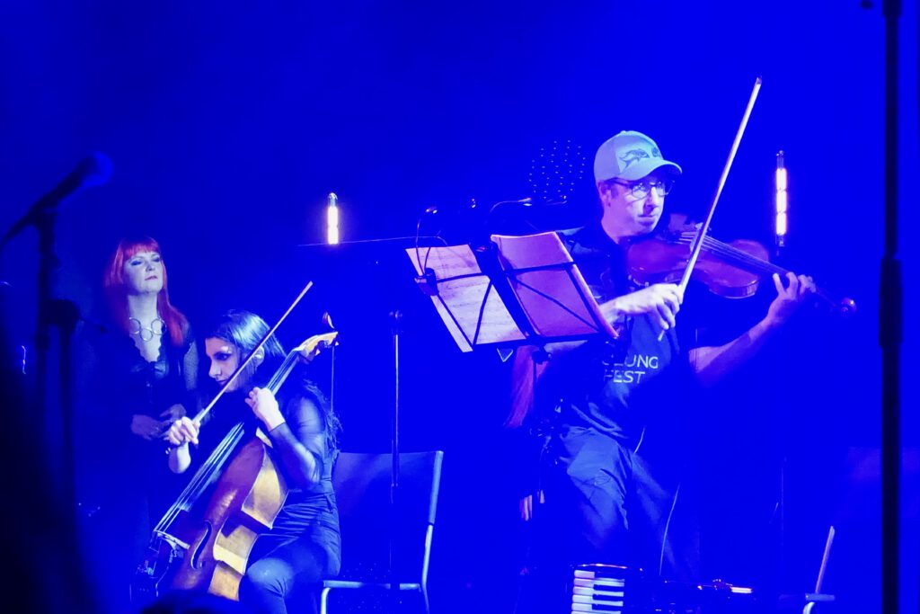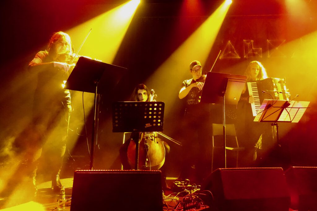 und, tja wie drückt man das nun korrekt aus?, musikalisch nimmt diese neue Doom-Ode an den ewigen Träumer die Themen vorweg bzw. wieder auf, die wir schon lange vom stampfend-wütenden, erwachten Tentakelträger kennen – das Publikum ist erneut begeistert und auch fassungslos, denn gerade mit der Unterstützung durch die gegen den Strich gebürsteten Streicher einerseits sowie die vordergründig lockenden Sirenenstimmen Chrysas und Riannes andererseits wird hier ganz allmählich eine dissonant-abyssale Atmosphäre aufgebaut, die geradezu vortexartig hinunter in die bedrohliche Tiefe zieht… Lovecraftian Vibes galore! Naturgemäss folgt darauf ‚Cthulhu‚, somit der erste bekannte ALKALOID-Song des Abends, bei dem die Band sofort schwer in seinen schräg rollenden Groove fällt, der jedoch diesmal noch hässlich, triefender wird, unterstützt und erweitert durch bizarr verzerrte Saiten. Wie das Bachfestival-Publikum auf diese fremden Welten reagiert? Überall wird mitgegangen, keiner kann sich diesem Sog entziehen. Einfach nur genial krank! Und wer sich nun fragt, ob dieses komplexe und viele Stimmen fordernde Stück jemals Eingang in einen ganz normalen Auftritt der Band finden wird – das ist im Januar 2026 bereits ein paar Mal passiert, zum ersten Mal hier in Karlsruhe anzusehen, und dabei wird deutlich, dass es sich um einen 150% ALKALOID-Longtrack handelt, der sich perfekt ins „normale“ Programm einfügt.
