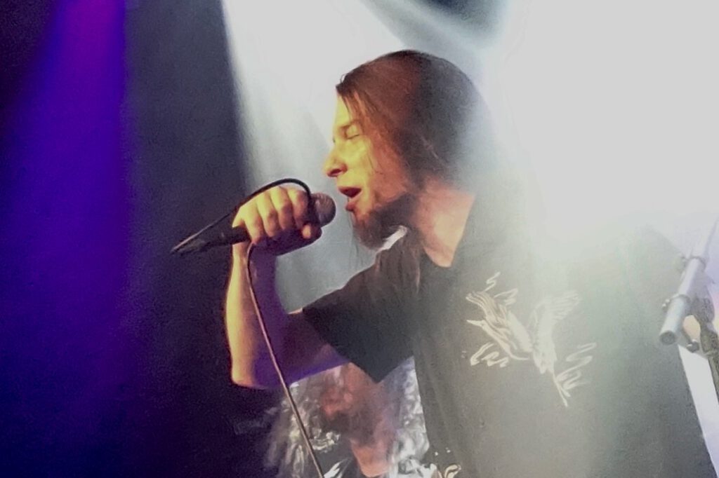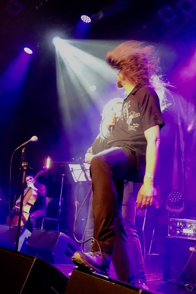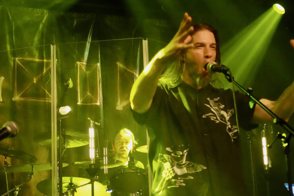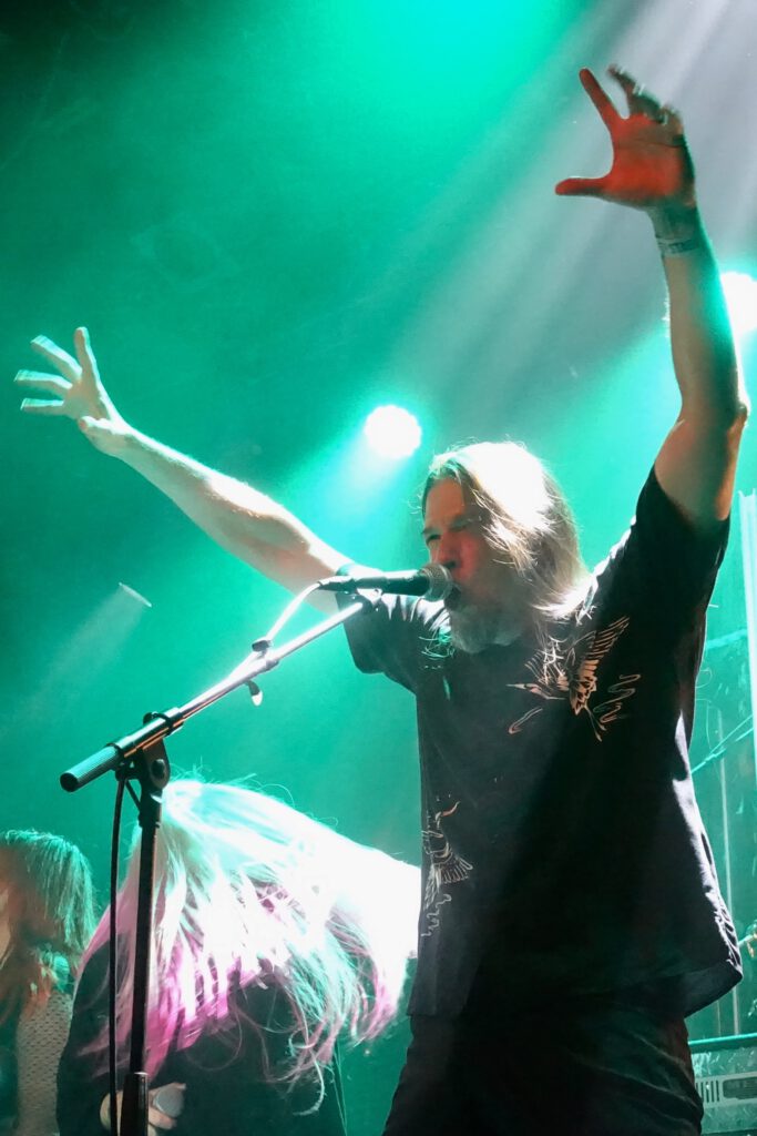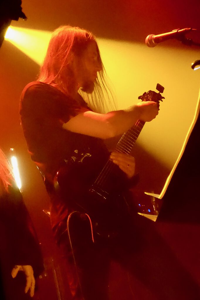 Wahrhaftig hat Rianne damit das Dach über uns in himmlische, ja wiederum kosmische Weiten geöffnet, und da wir uns so langsam dem Ende des Konzerts nähern, wird nun jegliche Rücksicht auf die „klassischen Besucher“ fallengelassen, und nochmal so richtig die fiese Deathmetal-Keule herausgeholt, ‚The Fungi from Yuggoth‘ brechen mit all ihrer plutonischen Macht über Dordrecht hinein, überall weht das verbliebene Haupthaar im Takt der Blastbeats, Morean growlt gegen all die Bässe um sich herum an, bis sich am Ende während des Drumsolos sogar noch ein jazziger, improvisierter Dialog zwischen Hannes und Oene van Geel ergibt, bei dem man geradezu den kosmischen Pilzen beim Ablästern über uns bescheuerte Erdlinge zuhören kann.